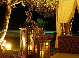 The small private bar leads into the relaxing courtyard, with soft green tones from the trees contrasting with the sandy colours of the mosaique floor, providing a candlelit evening or fresh breakfast experience.